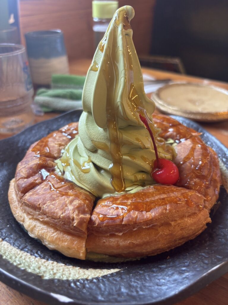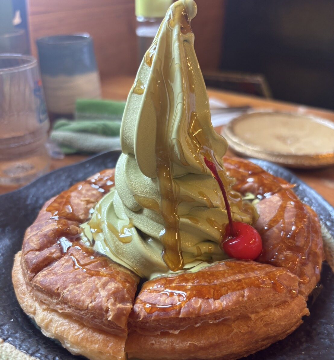 写真はおかげ庵で食べた、抹茶味のシロノワールです。
